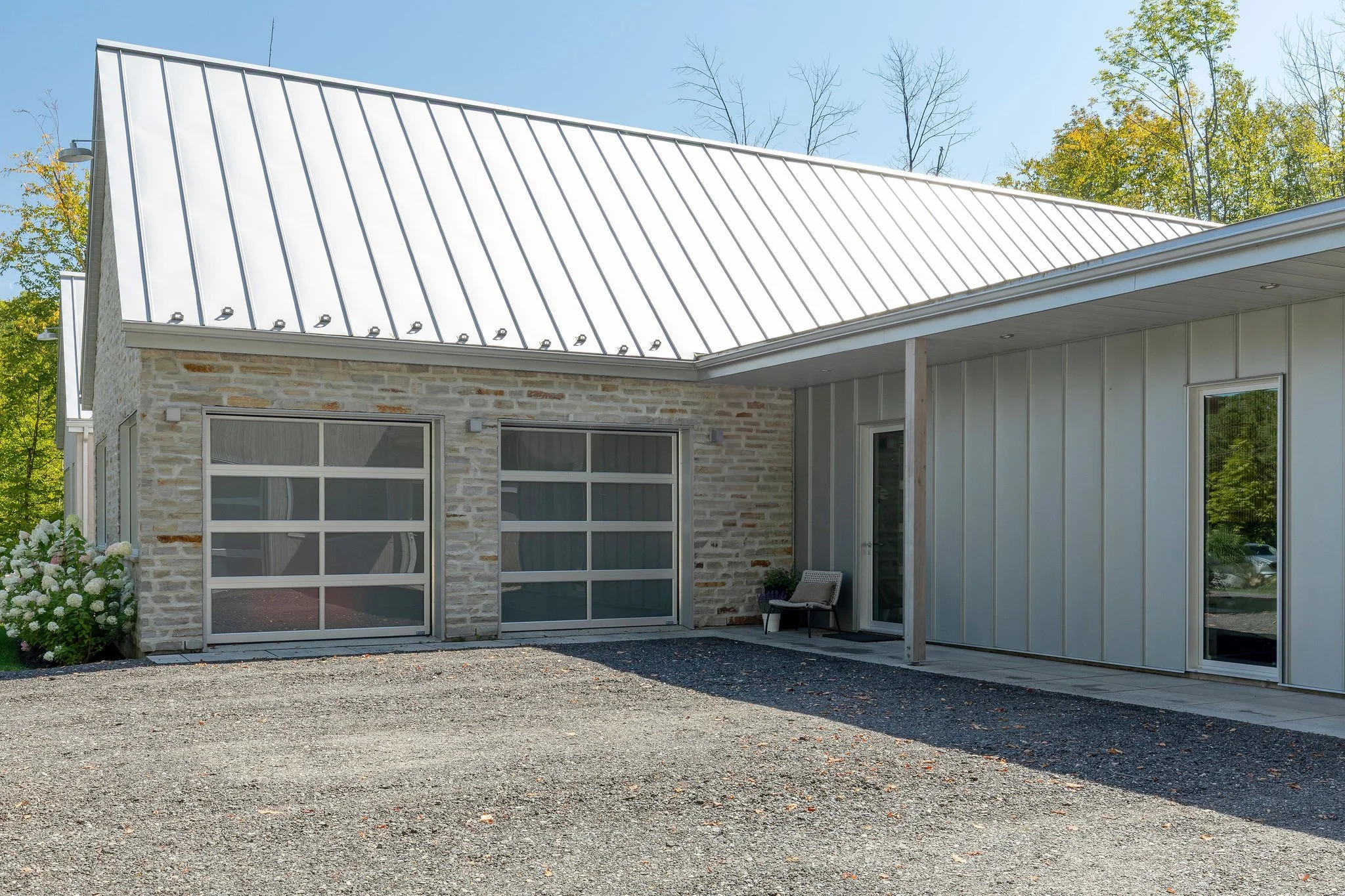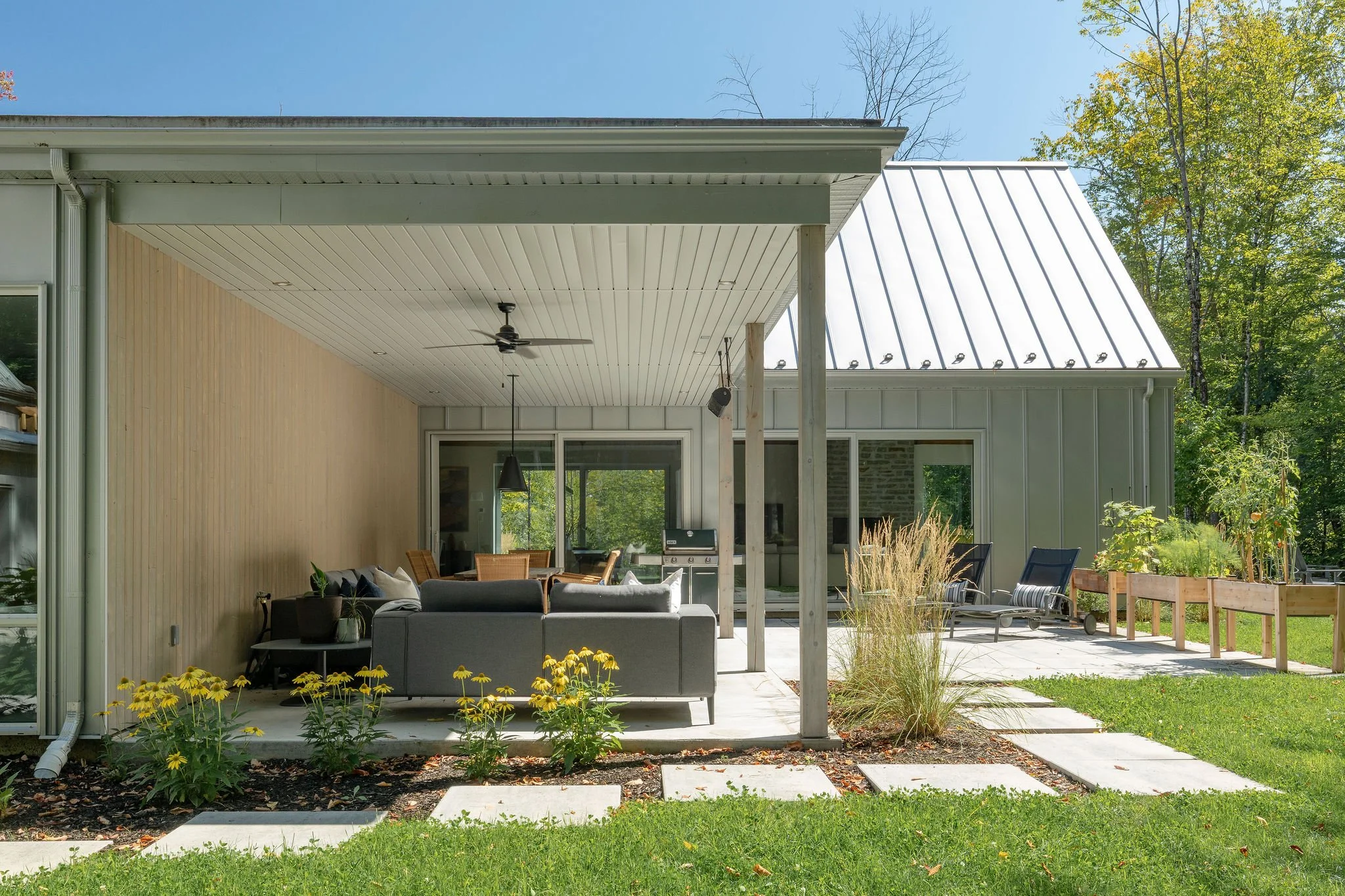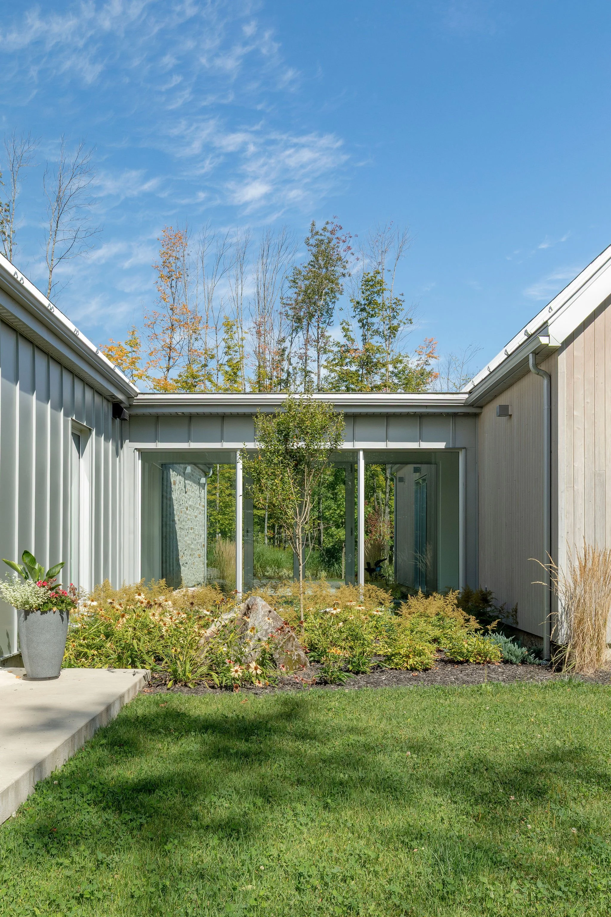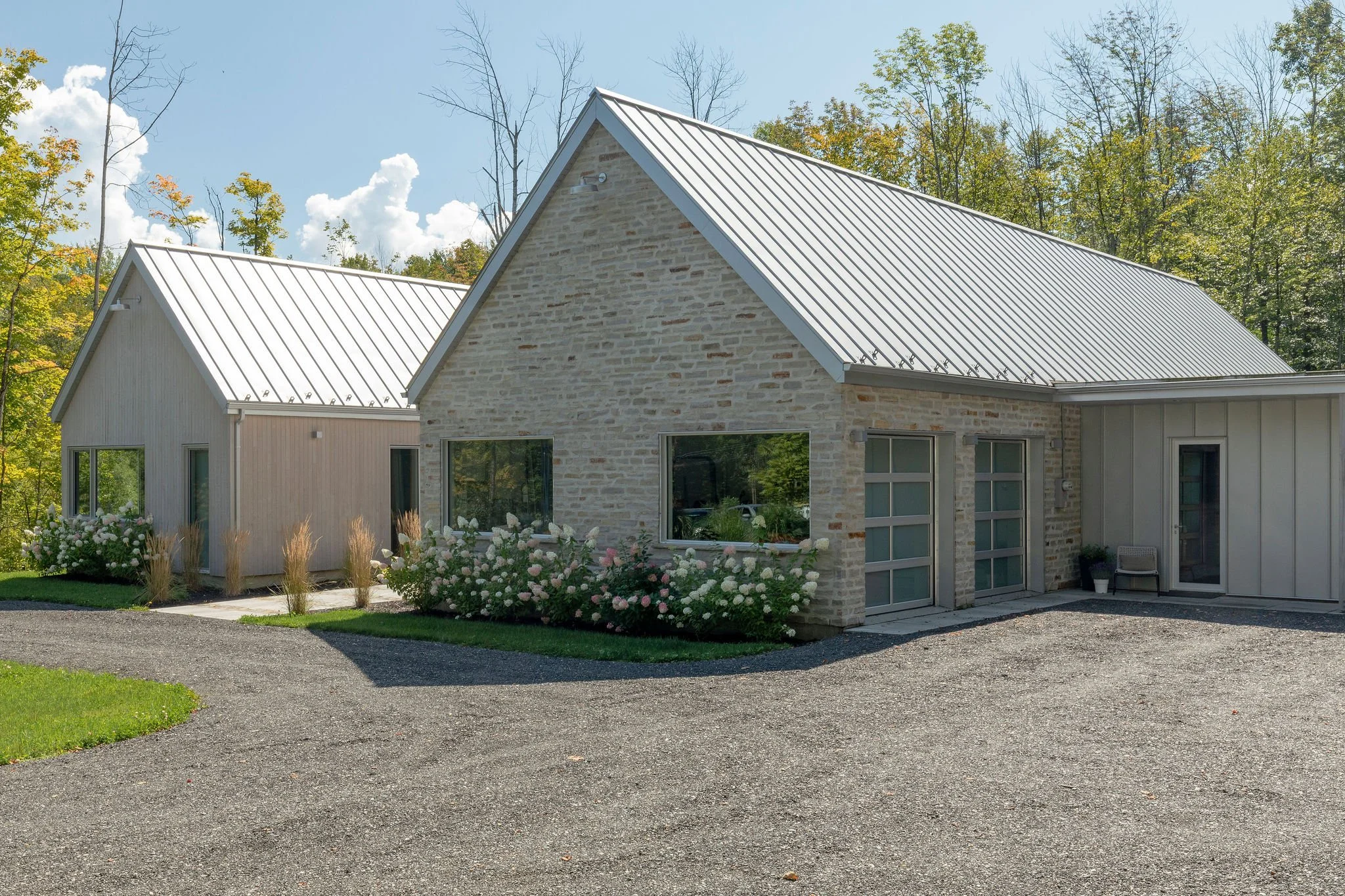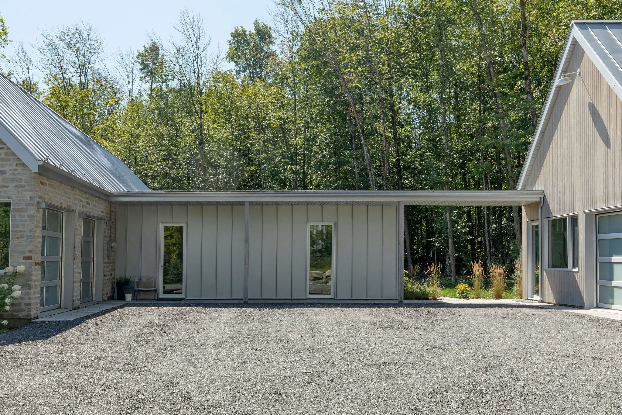 Aménagement complet d'une résidence incluant une annexe pour les invités, un espace pour recevoir un grand groupe, dans un style contemporain et chaleureux.